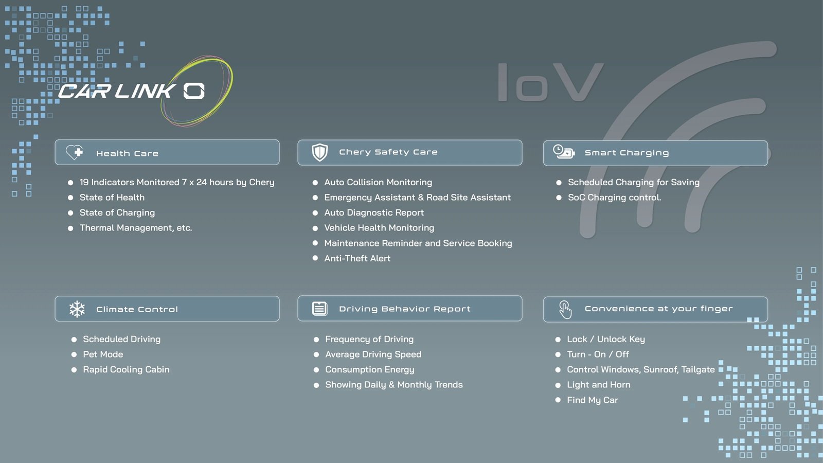 Teknologi IoV yang disematkan pada CHERY E5 memungkinkan konektifitas cerdas untuk mengintegrasikan mobilmu dengan perangkat cerdas dan cloud services untuk pengalaman berkendara yang maksimal.