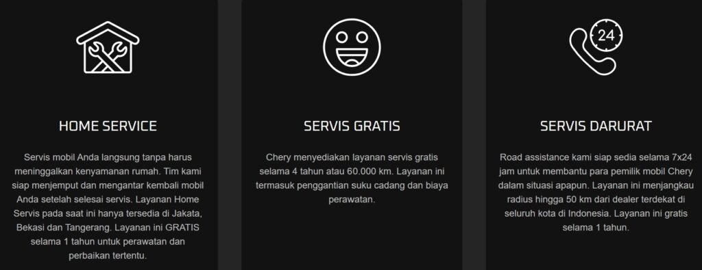 Chery menjamin layanan servis gratis di seluruh bengkel resmi Chery Indonesia selama 4 tahun atau 60.000 km bagi seluruh pengguna mobil Chery Indonesia.