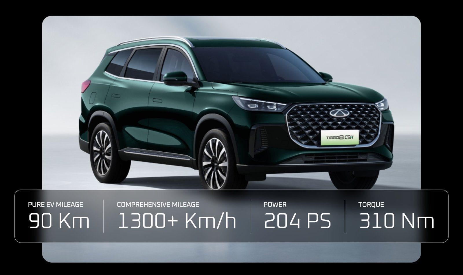 Rasakan performa terbaik dari TIGGO 8 CSH, mobil hybrid paling efisien layaknya mobil listrik. Dengan konsumsi bahan bakar 76 km/l, mesin TIGGO 8 CSH dapat menukar energi listrik ke tenaga mesin dengan mulus untuk performa yang maksimal.